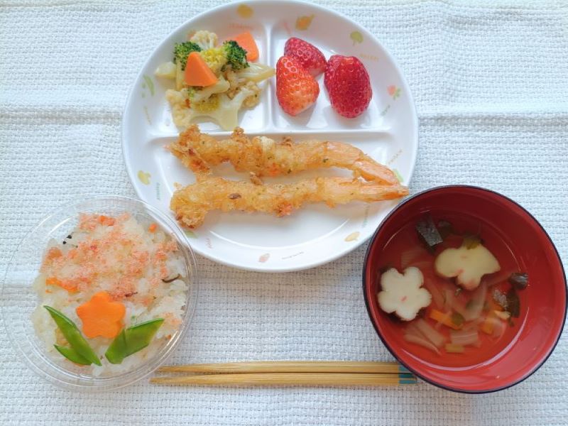 給食は五目寿司と今年度初登場のえびの野菜衣揚げです。